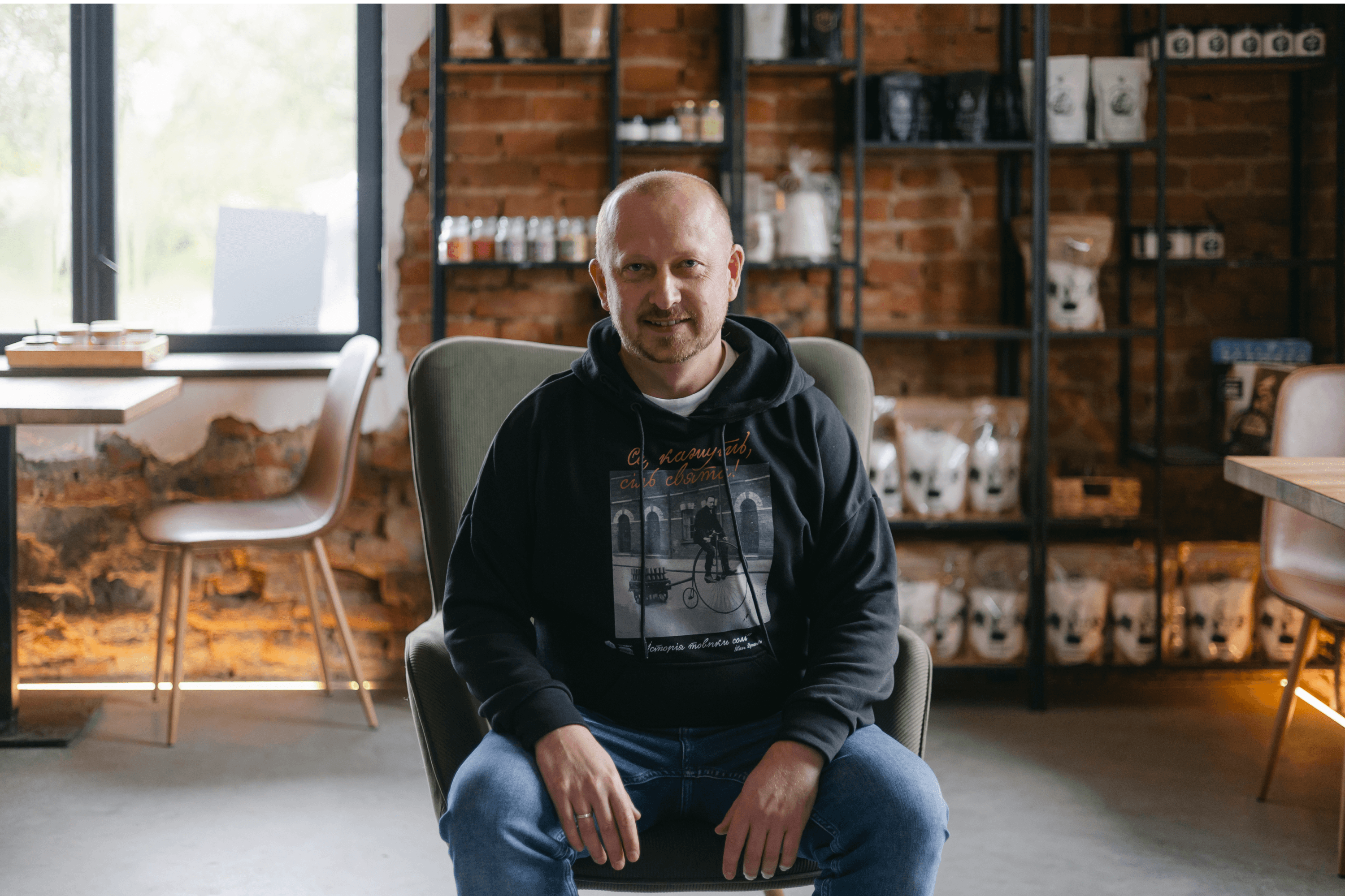 Petrenko is forty-one. Short in stature, he wears jeans and a black hoodie printed with a collage of Ivan Franko riding a bicycle and carrying salt. It is part of the Drohobych Saltworks’ merchandise. He wears it often, always ready to tell people about the enterprise.