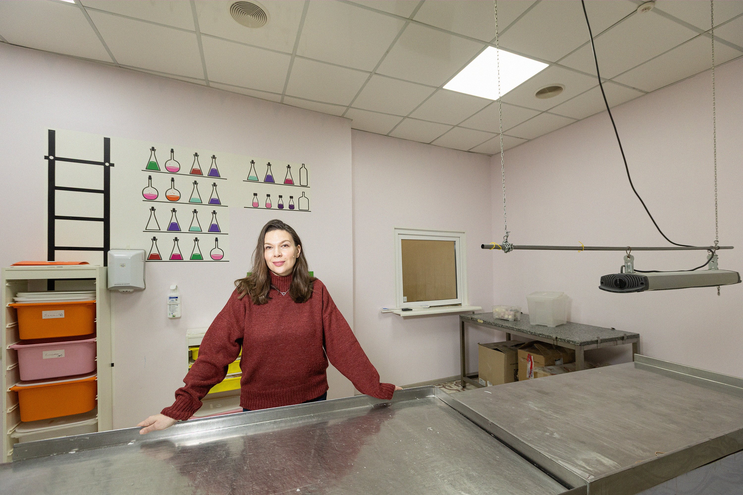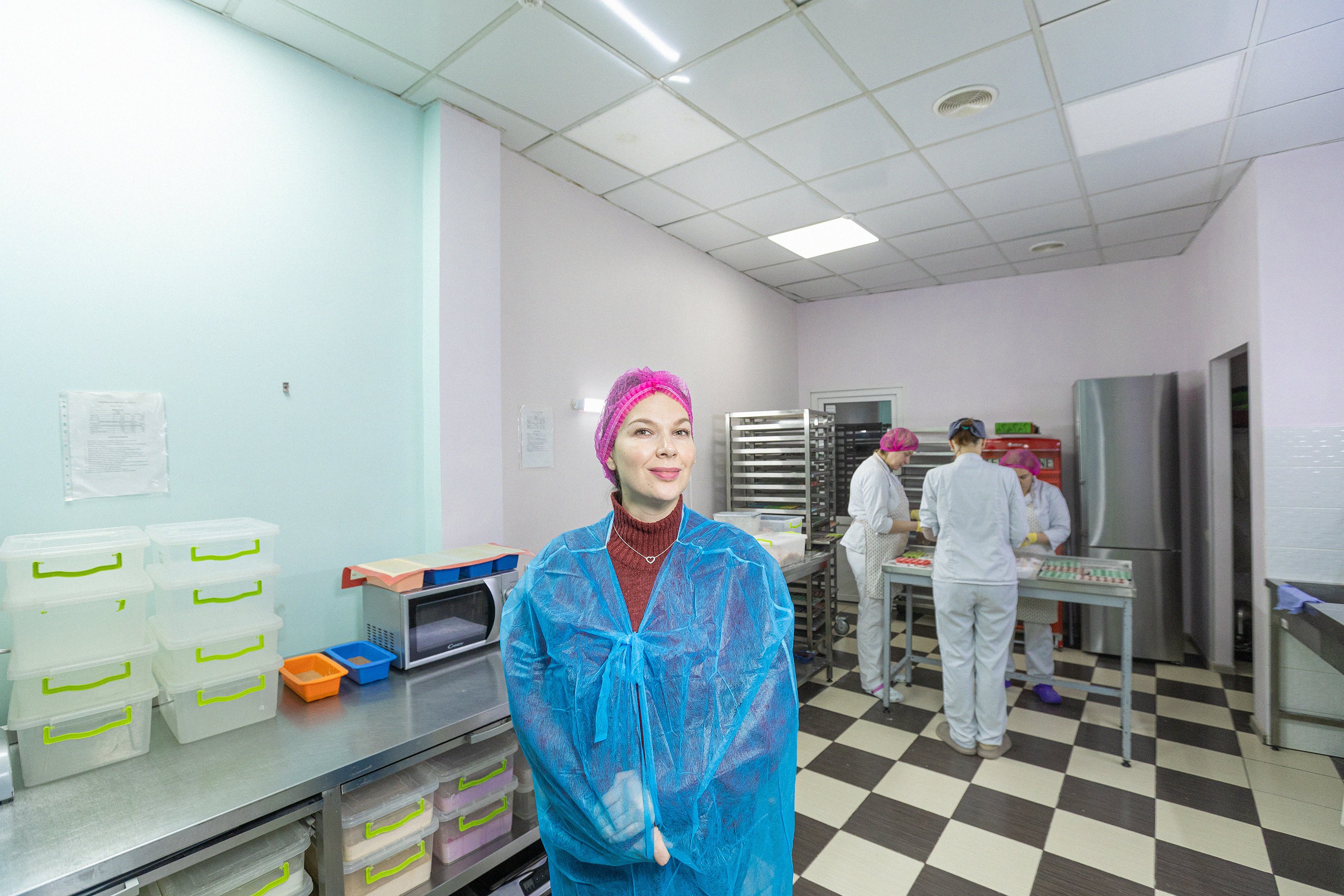 Olena Tokar, the owner of the business, gives us a tour. She’s dressed casually and holds disposable polypropylene gowns and caps. Without them, entry to the production areas is prohibited. Tokar says with regret that before the COVID-19 pandemic, the space had a shop and held workshops and children’s events. Now it’s a warehouse. While the war continues, the store will remain closed.