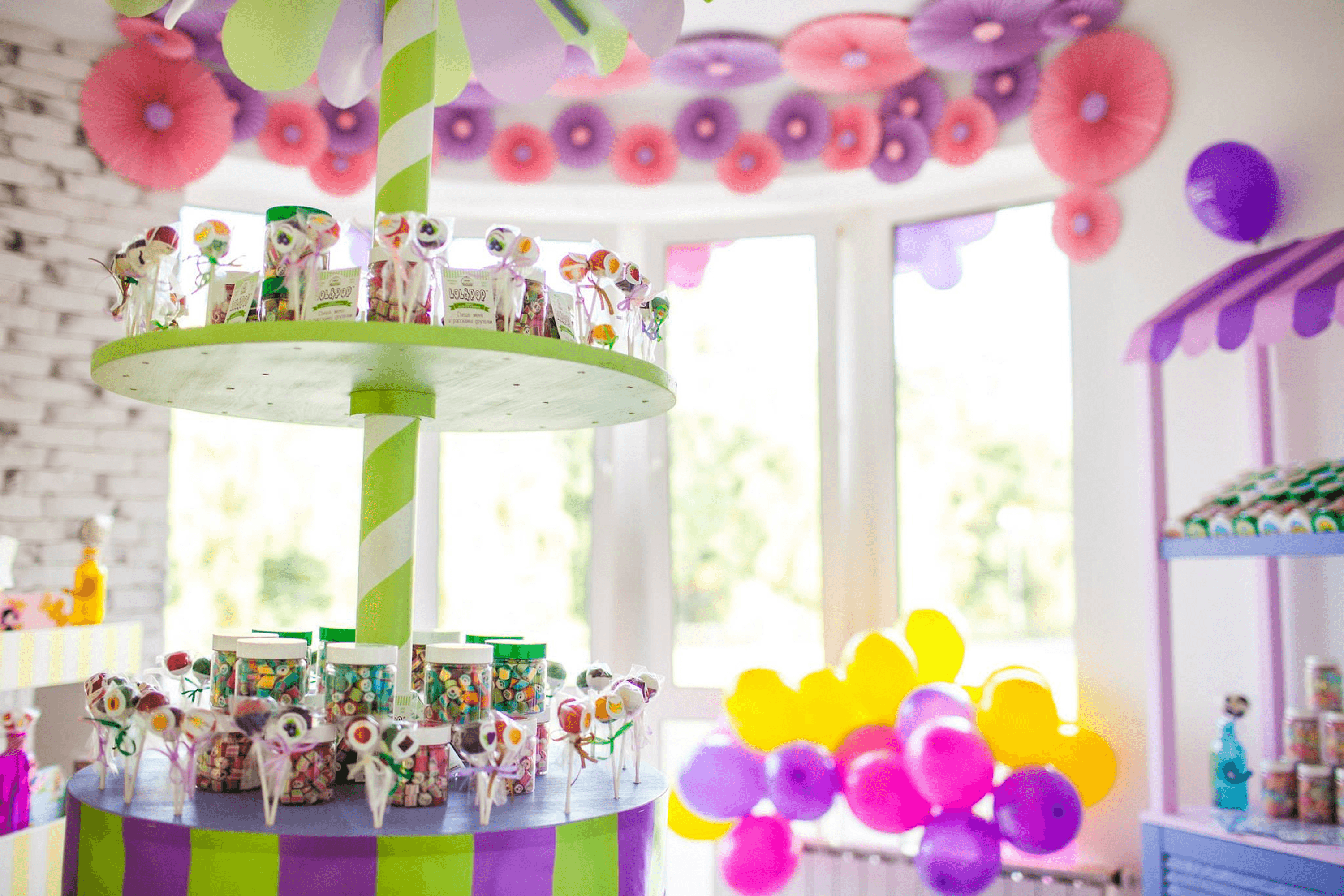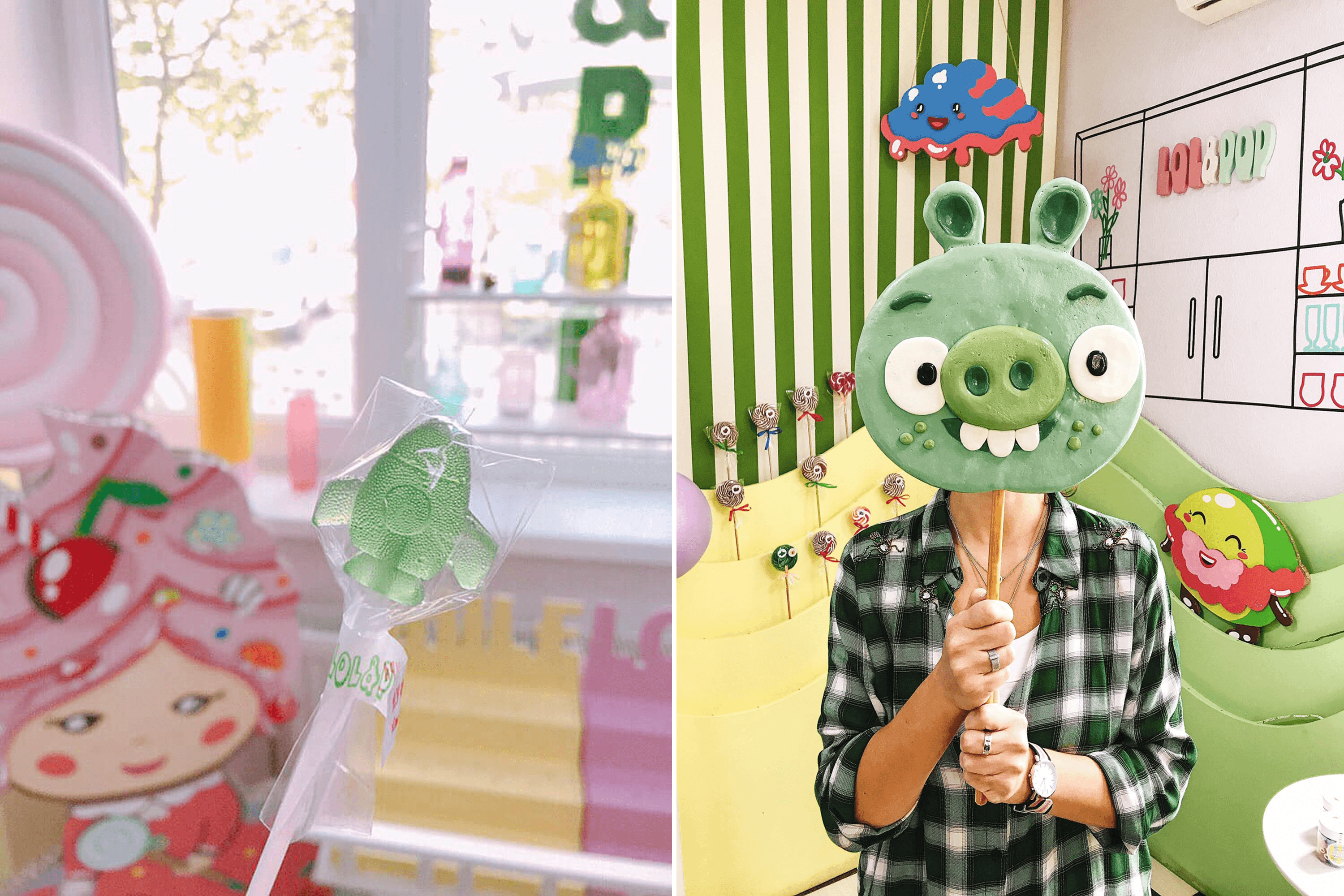 Inside, colorful figurines of candies, lollipops, and cotton-candy clouds hang from the ceiling. Gift boxes with Christmas designs line the shelves of bright display stands, alongside large stacks of packaging, stickers, and boxes of jellies. A large cardboard figure of the mascot stands nearby, a girl holding a lollipop, with candies woven into her pink hair. This character appears on all Lol&Pop packaging.