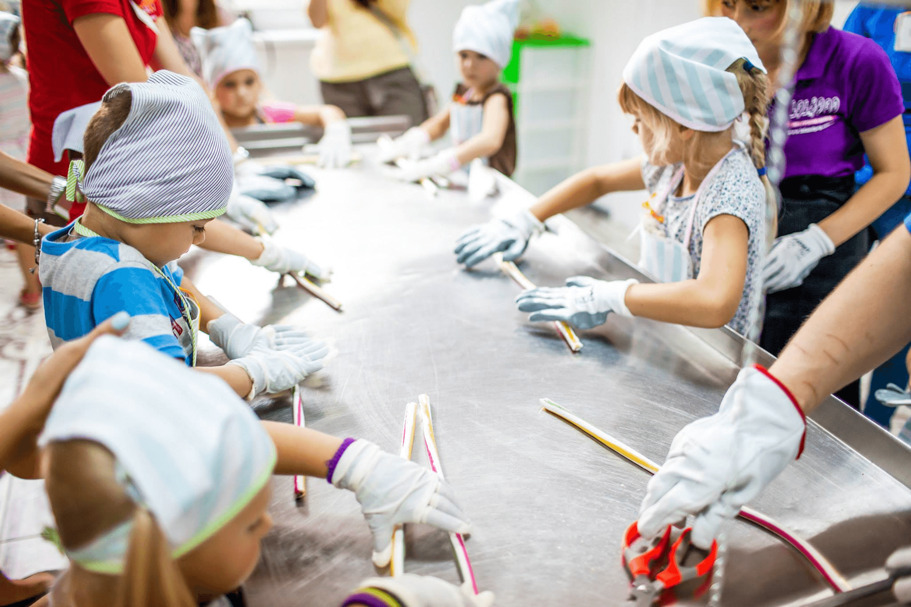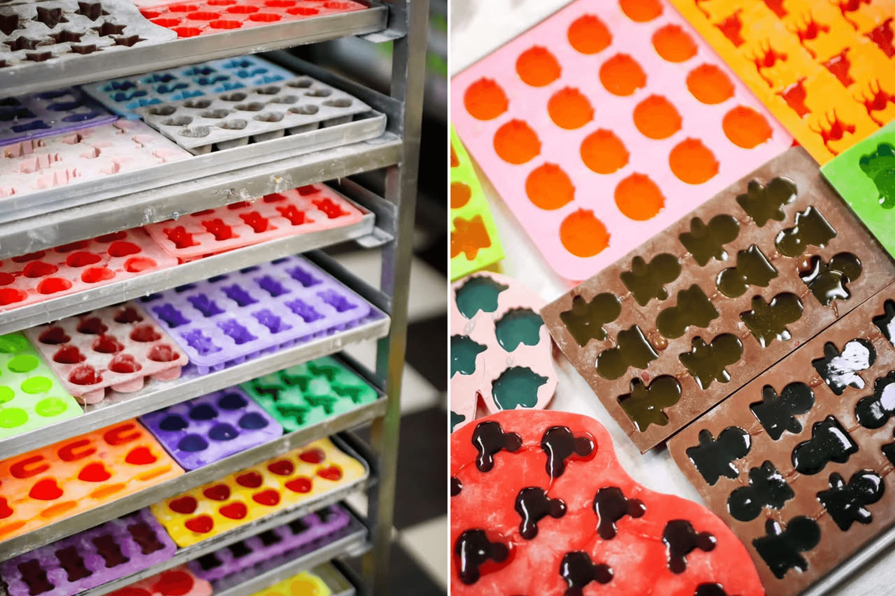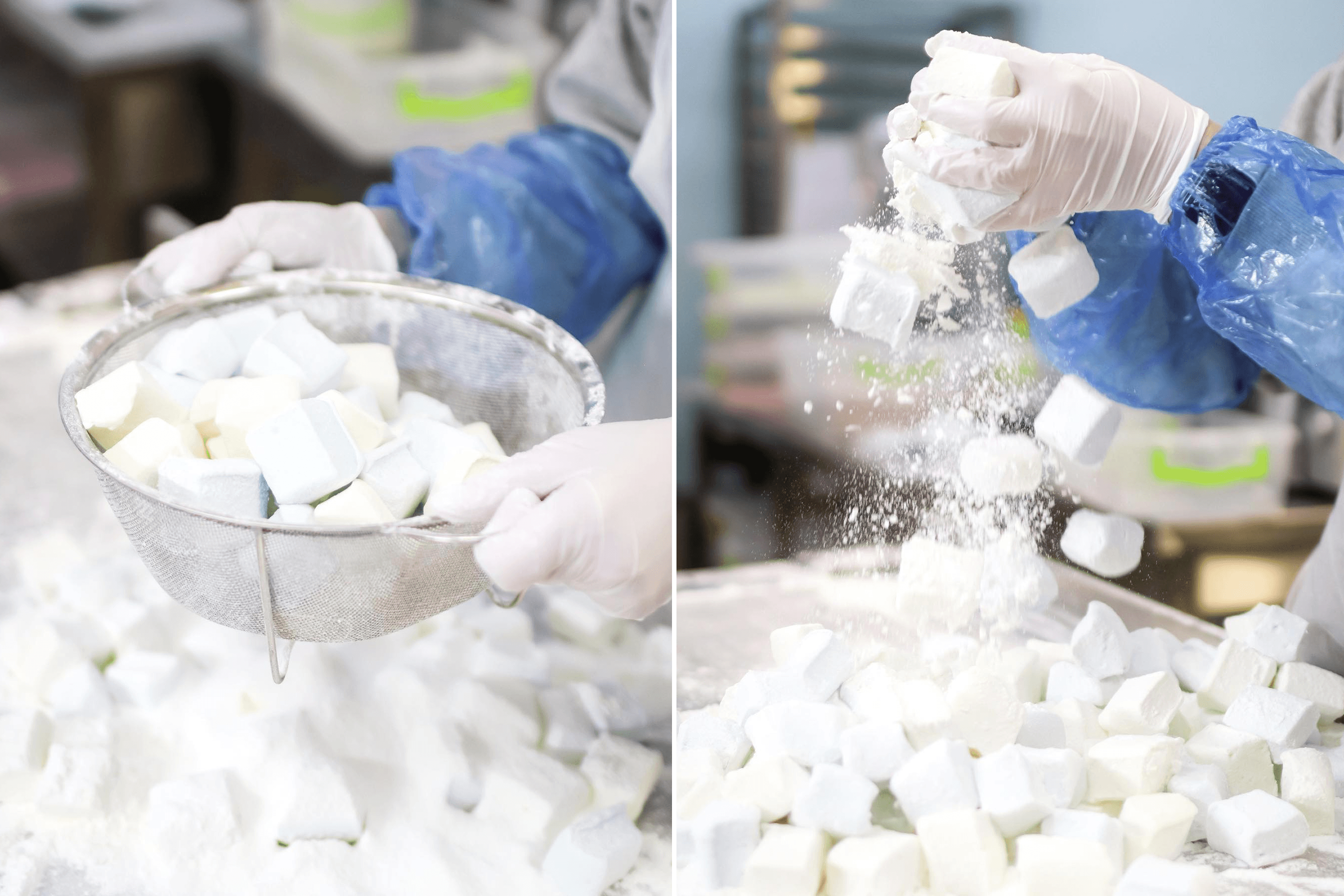 Right now, three confectioners in aprons and bandanas are working in the marshmallow and jelly workshop. They stand at a stainless-steel table, removing colorful jellies from silicone molds and rolling them in powdered sugar. On a nearby table sit large plastic containers filled with rainbow-colored marshmallow mixture, tightly sealed with lids. Later, they will cut this mixture into small pieces. To color the marshmallows, they use natural extracts like blackcurrant, paprika, vanilla, and black carrot.