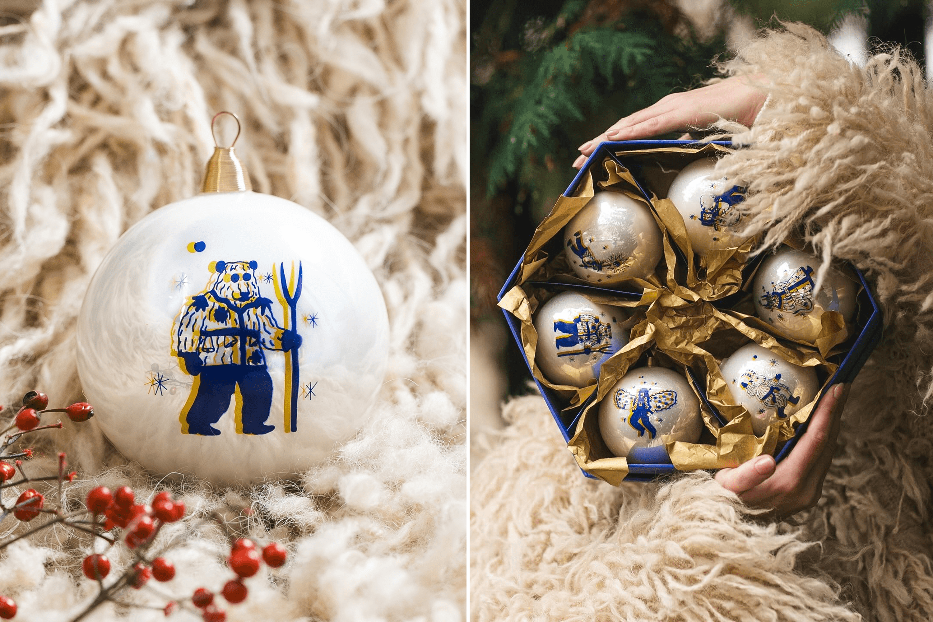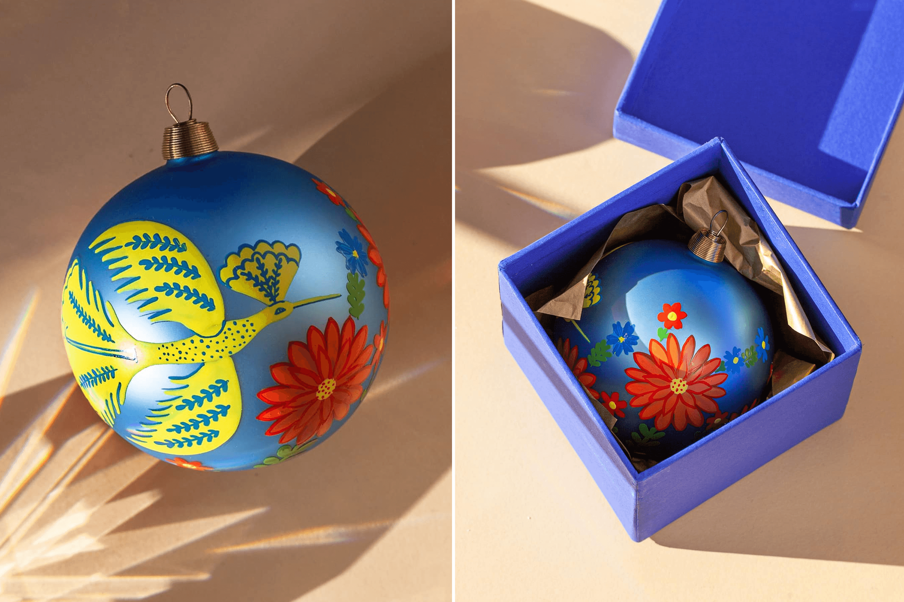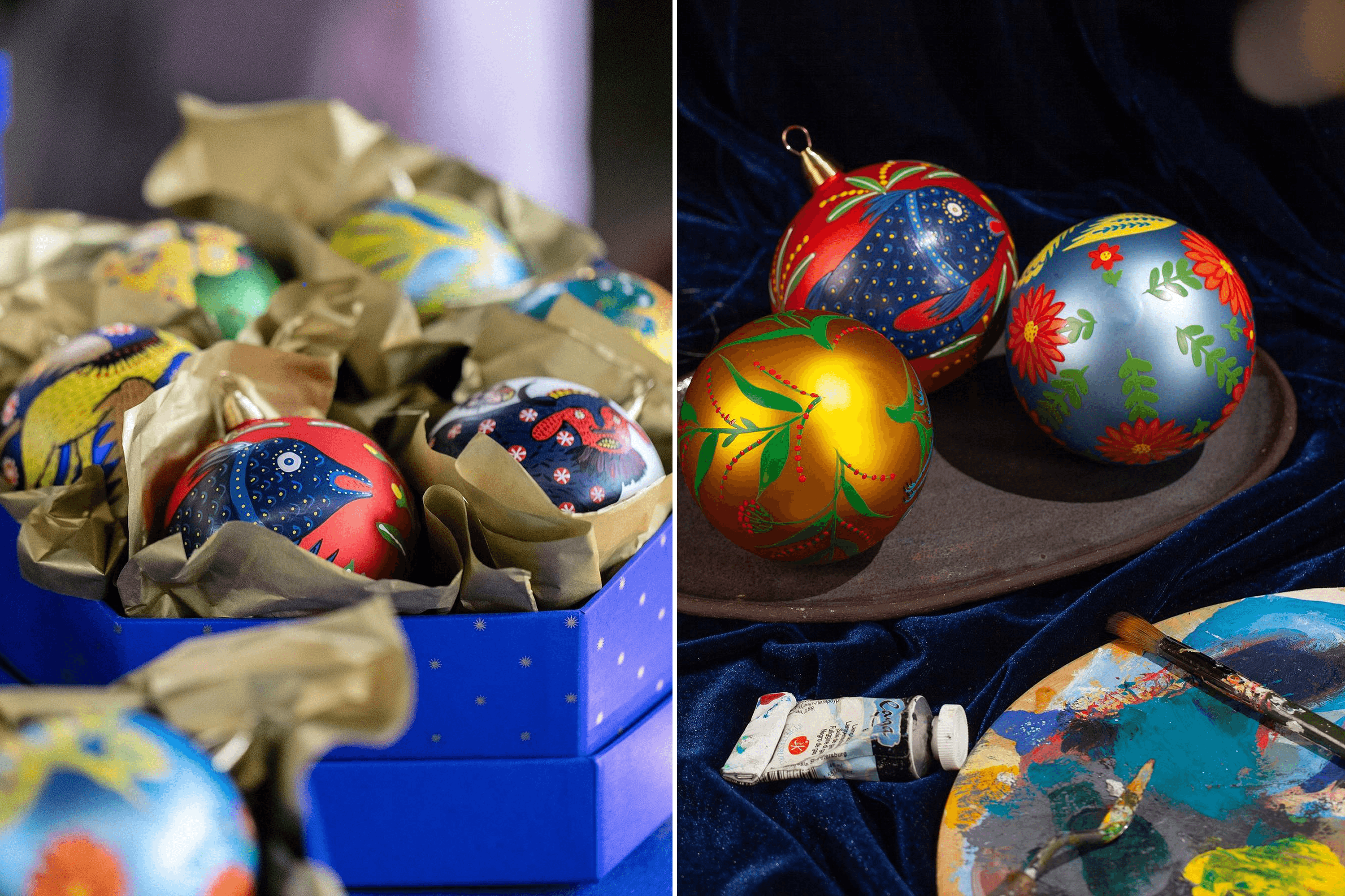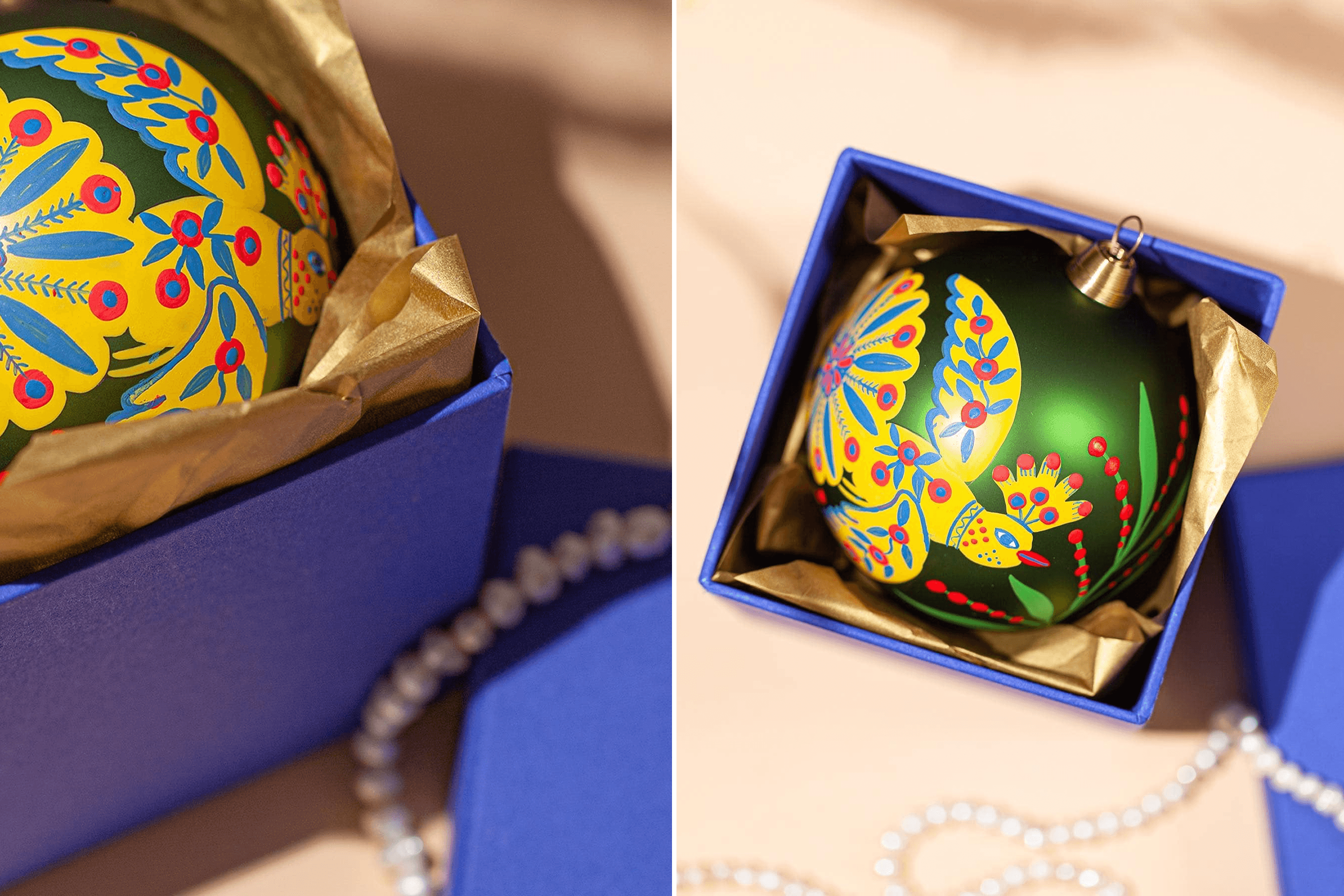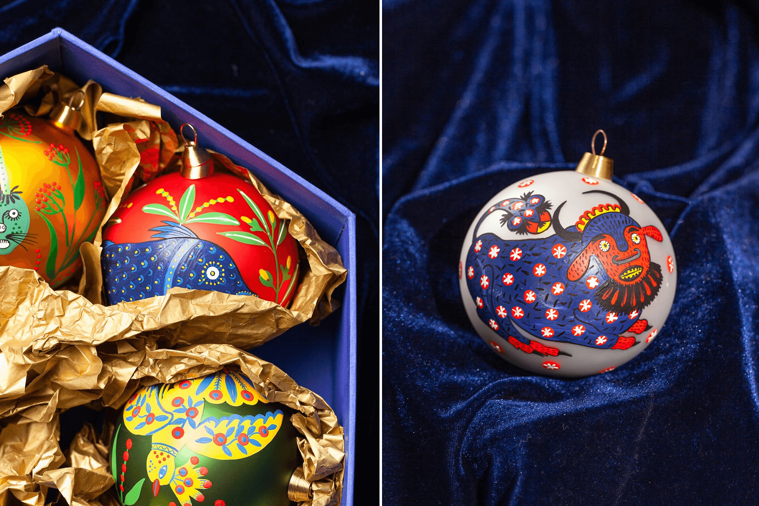 Pavlo: I borrowed $2,000 from my brother. With that money, we ordered molds to make the trident and a collection of glass christmas ornaments featuring paintings by Maria Prymachenko. That was our response to the Russians destroying her museum in Ivankiv. We signed a licensing agreement with the Prymachenko family foundation to use elements of her paintings on the ornaments.