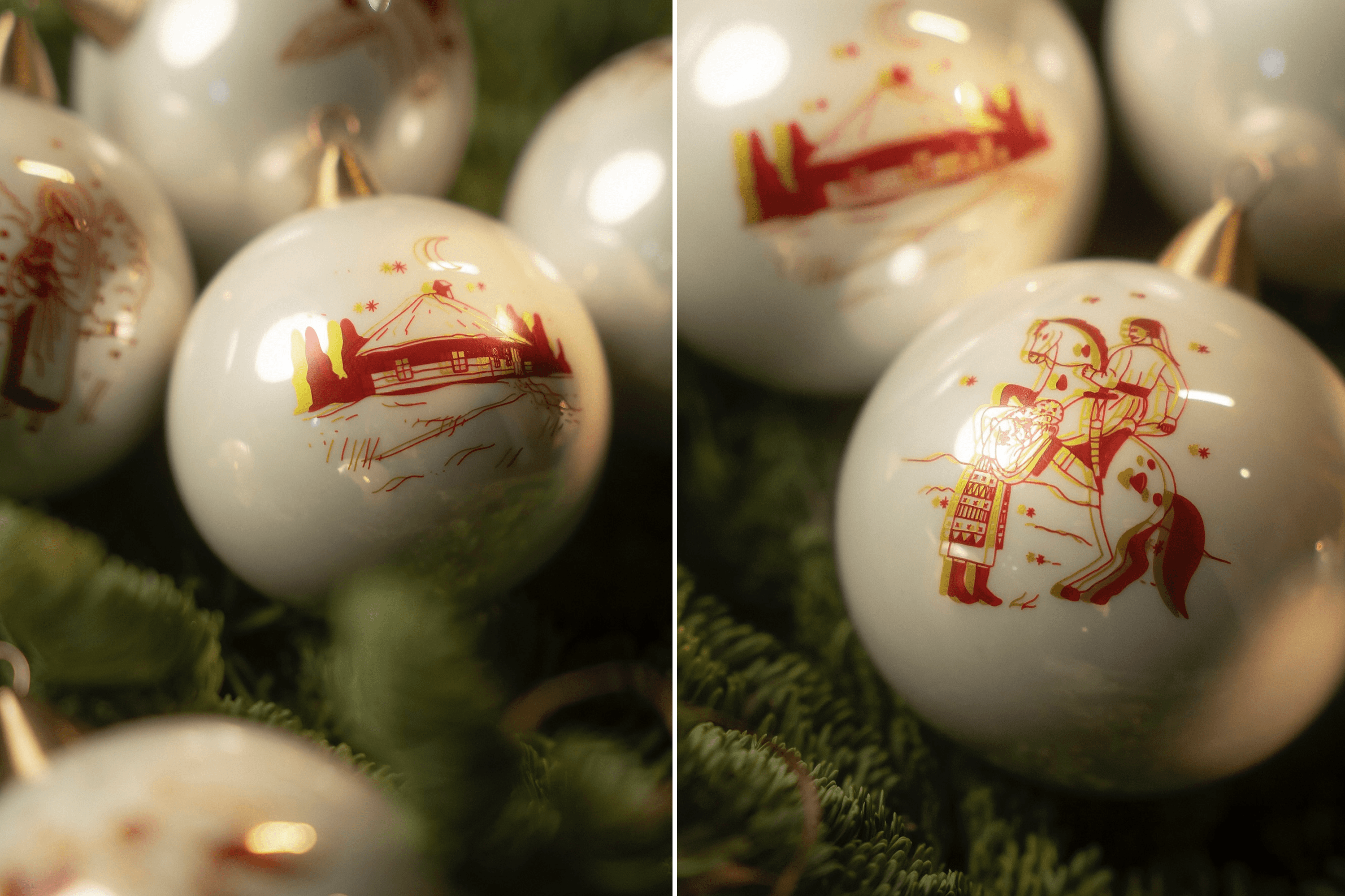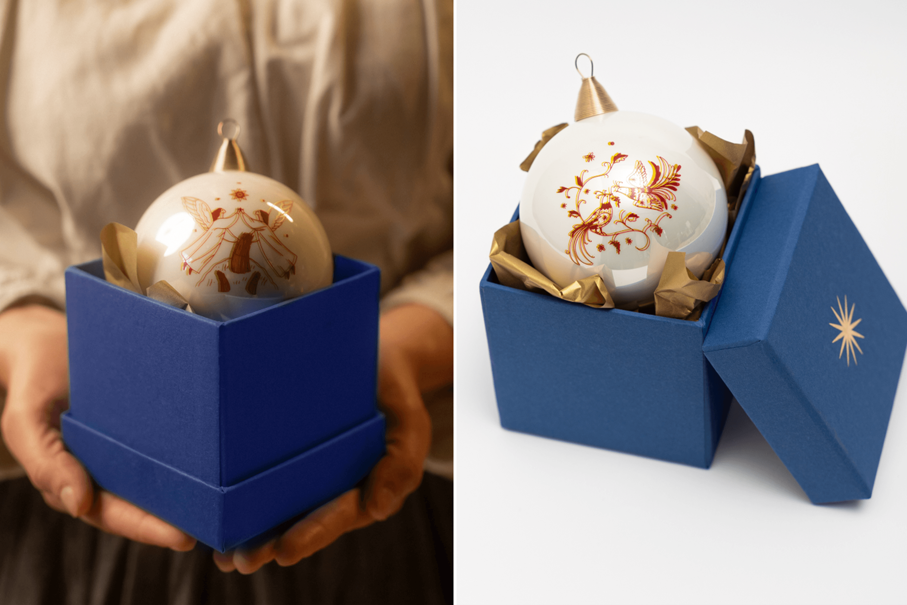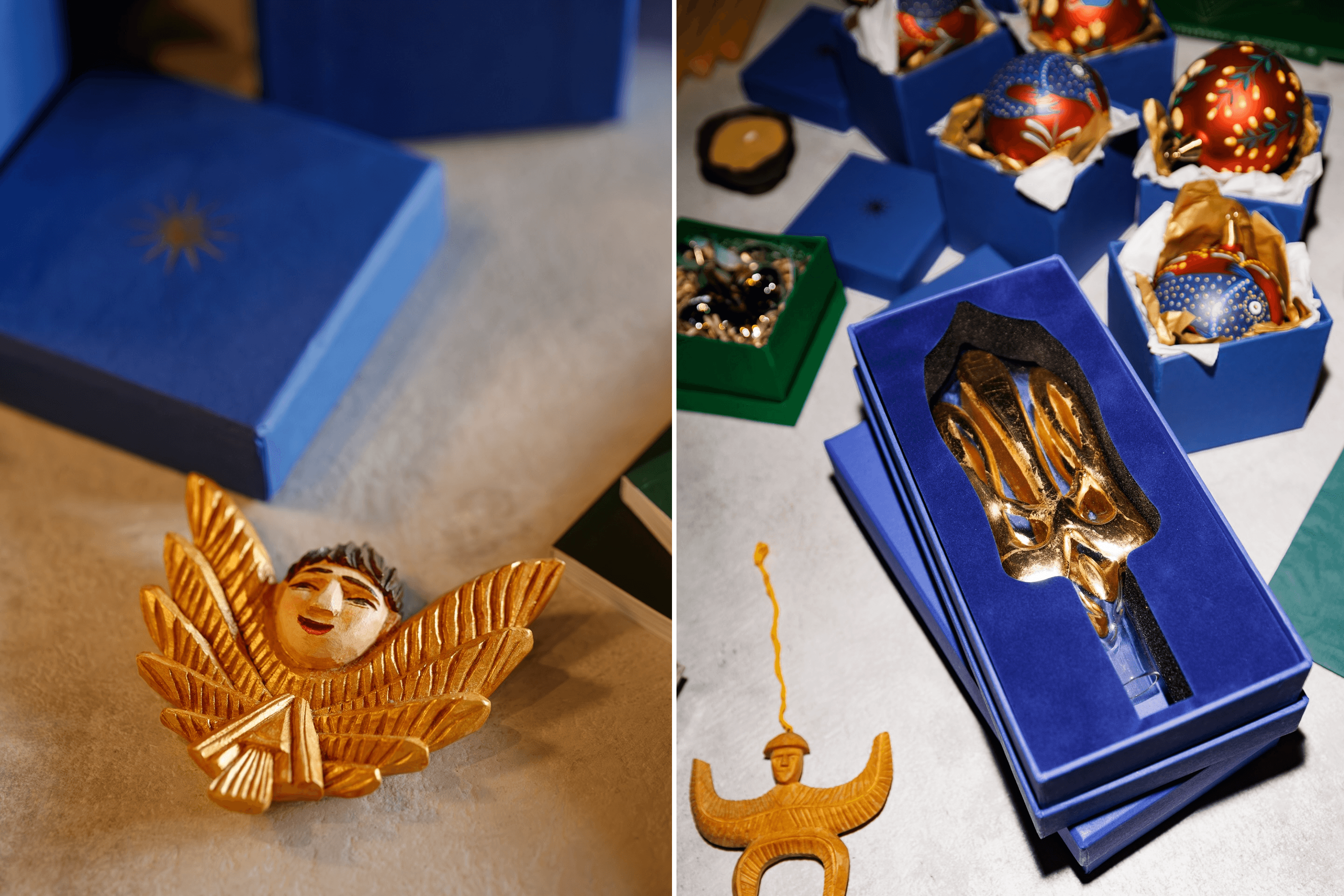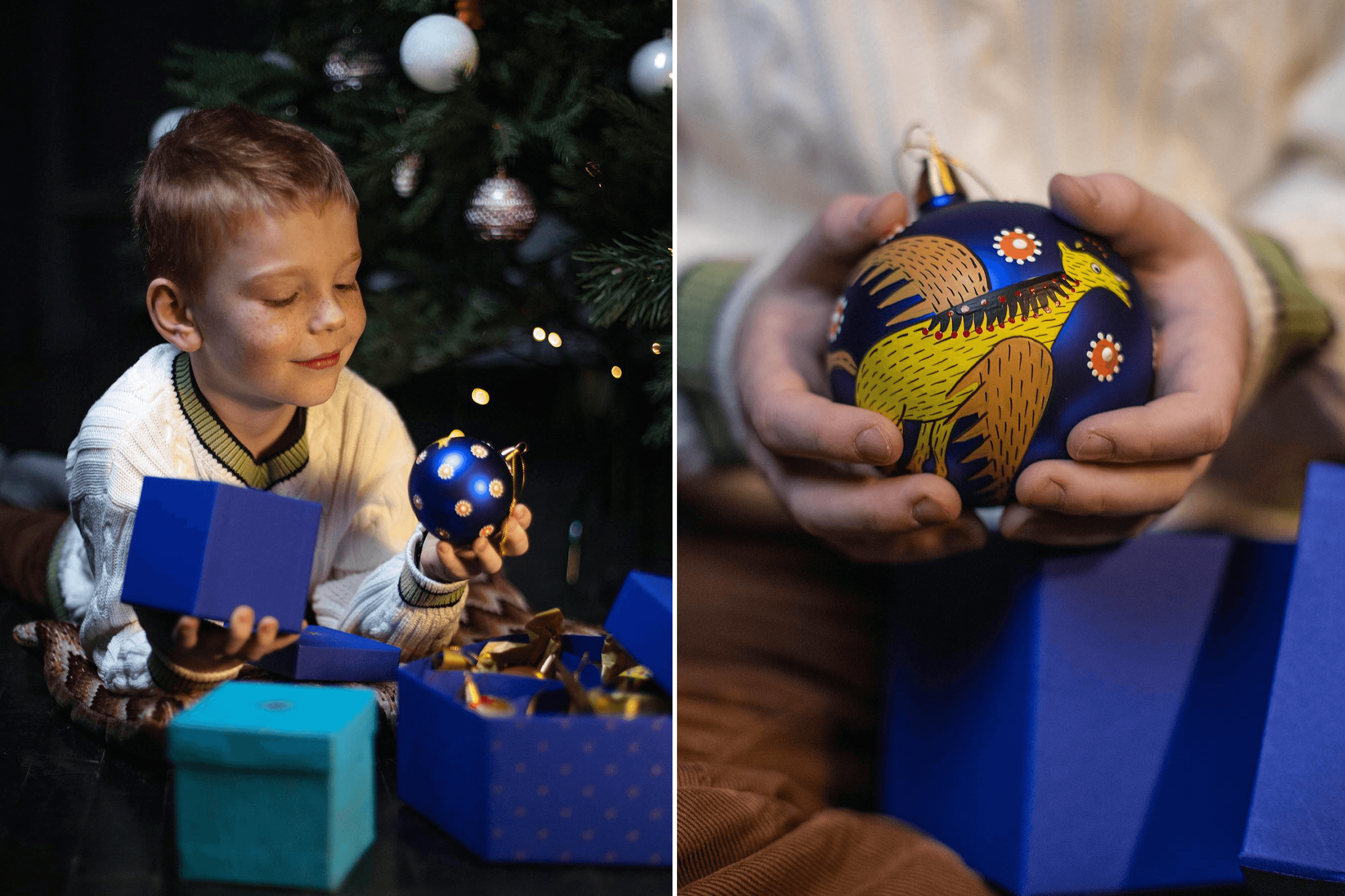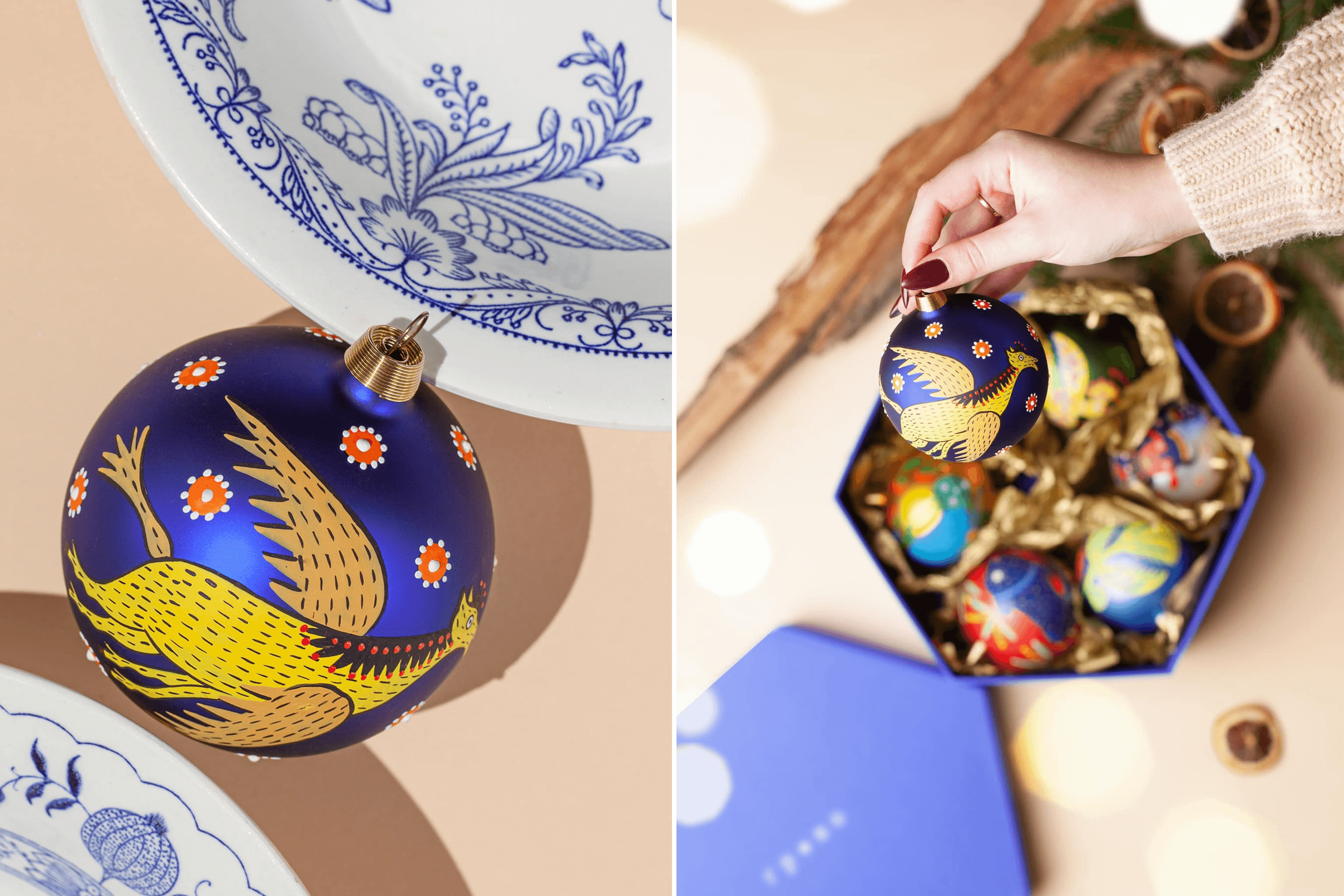 Pavlo: I borrowed $2,000 from my brother. With that money, we ordered molds to make the trident and a collection of glass christmas ornaments featuring paintings by Maria Prymachenko. That was our response to the Russians destroying her museum in Ivankiv. We signed a licensing agreement with the Prymachenko family foundation to use elements of her paintings on the ornaments.