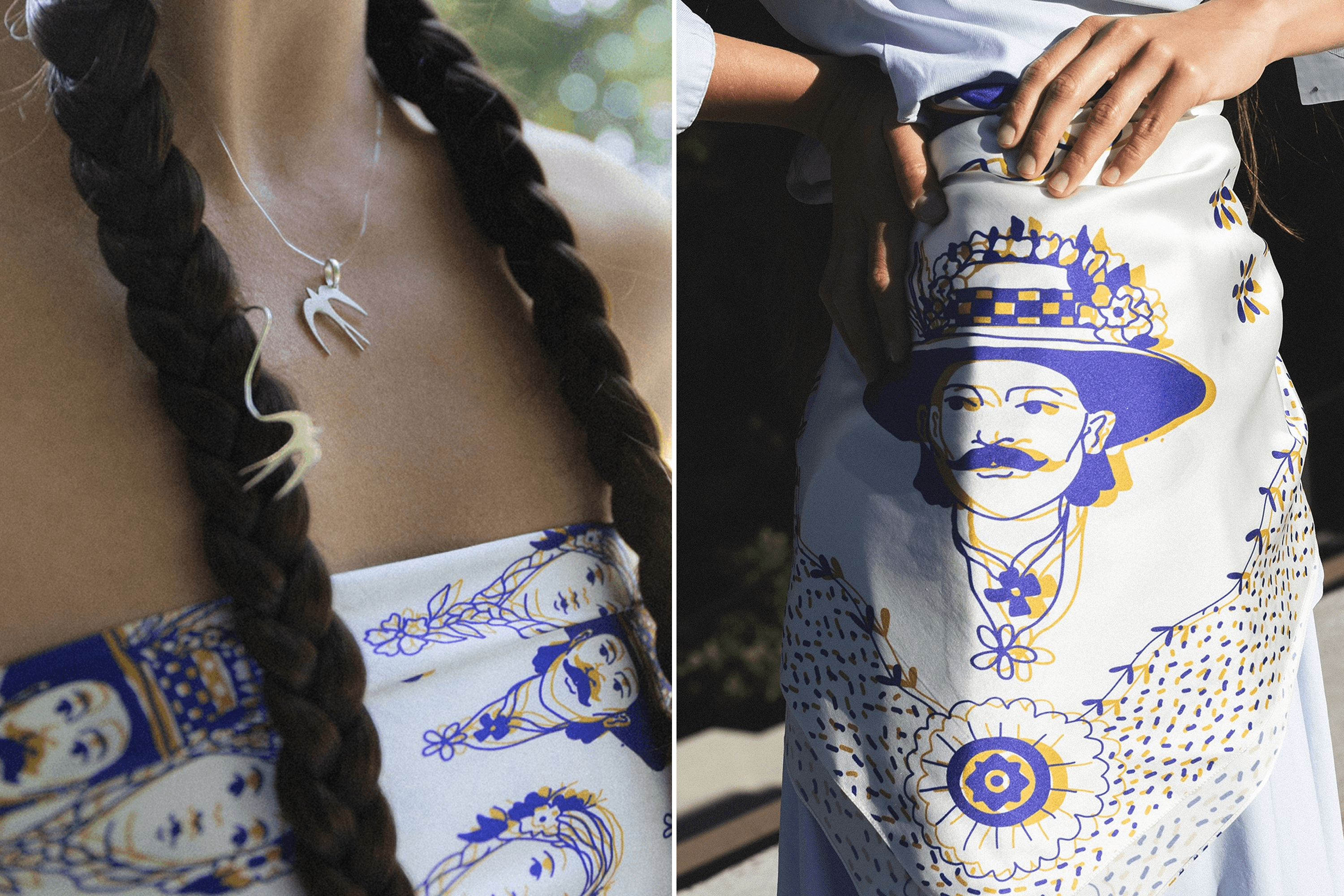 Yuliana: We pay royalties to the Prymachenko family foundation and to tattoo artist Oleksandr Lutsyshyn, who created the Malanka ornament collection and the Tanok line of scarves and jewelry. The Ukrainian cities collection is our own design, so no royalties there, but we donate 10 percent of sales to the 1991 foundation, which helps cover the military’s needs.