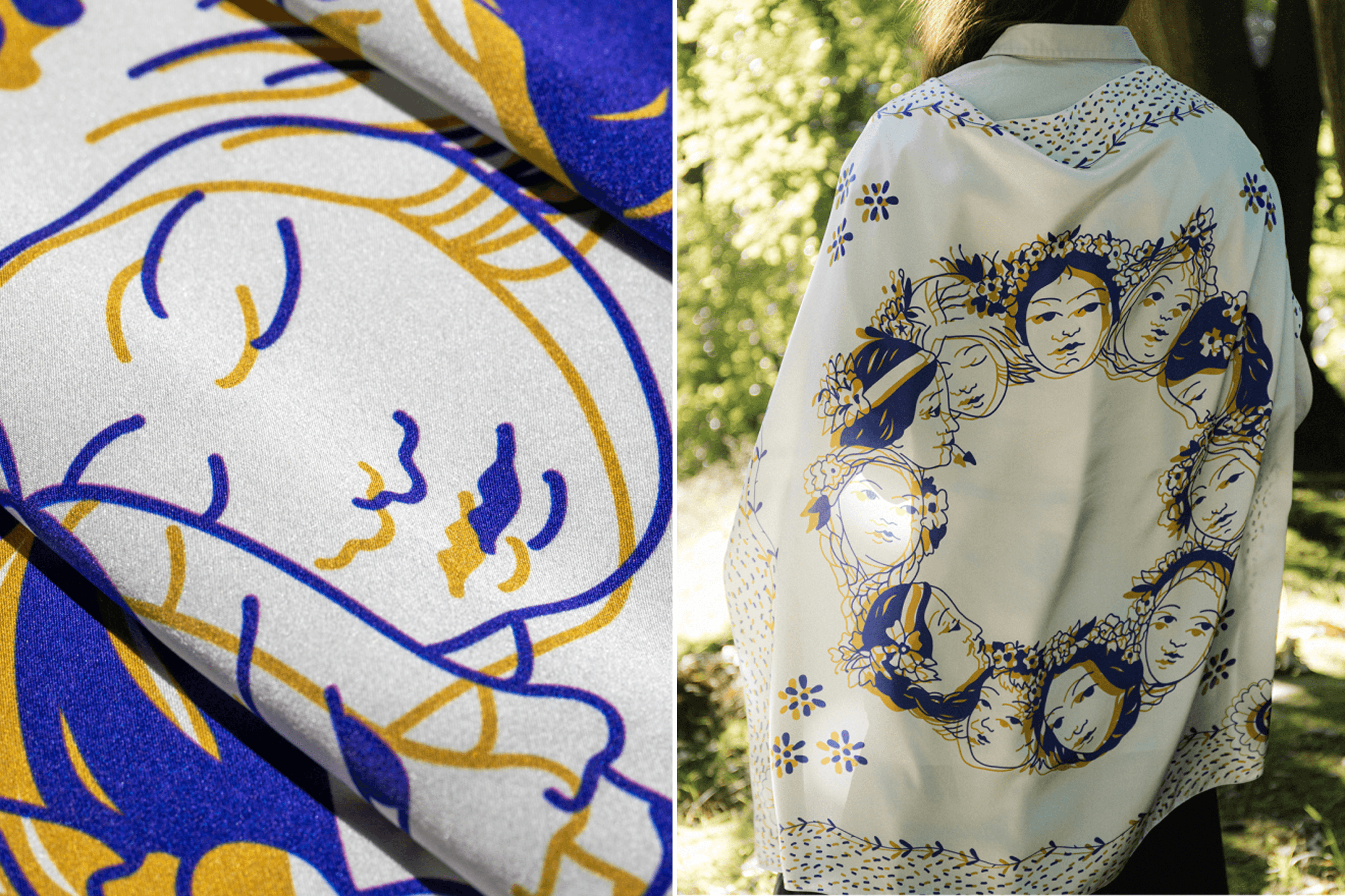 For the textile line, we drew on paintings by naive artist Hanna Sobachko. She died in 1965 and her work is in the public domain, so we can use it freely. Polina Rayko died in 2004. Her only works are the murals on her house in Oleshky, which is now under Russian occupation. To preserve them, we transferred them onto our products.
