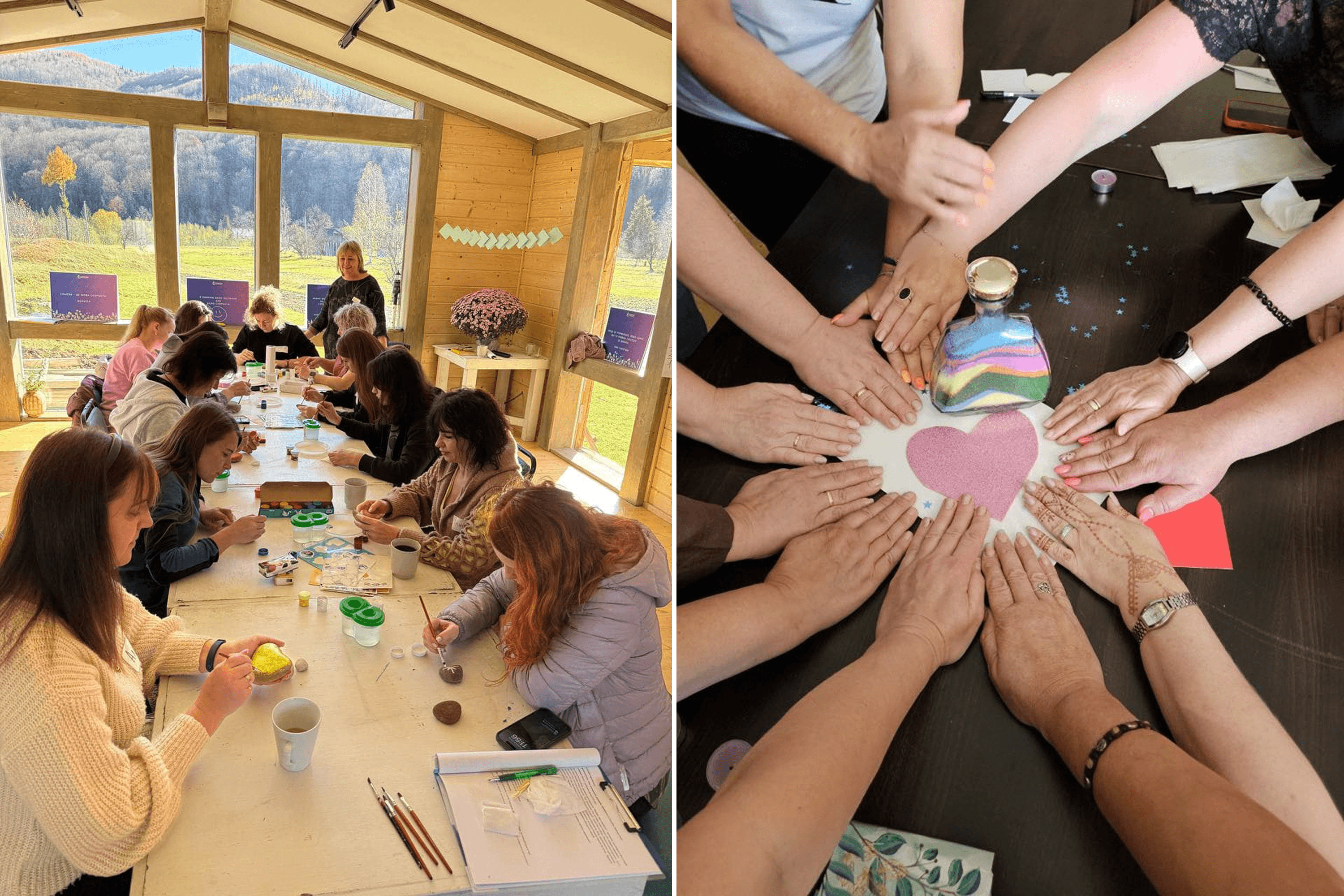 The retreat lasts five days—20 hours of group therapy in a circle. In the morning, we practice acceptance therapy, narrative therapy (where women share their experiences), art therapy exercises, and bodywork. In the afternoon, there is a recreational program. We take them for walks in the mountains, to museums where they can see authentic old clothing or learn about Hutsul grieving traditions, or for hydro-procedures, such as the traditional Carpathian chans (hot tubs). In the evening, we hold creative workshops for those who have the energy. The women make necklaces or paint on glass.